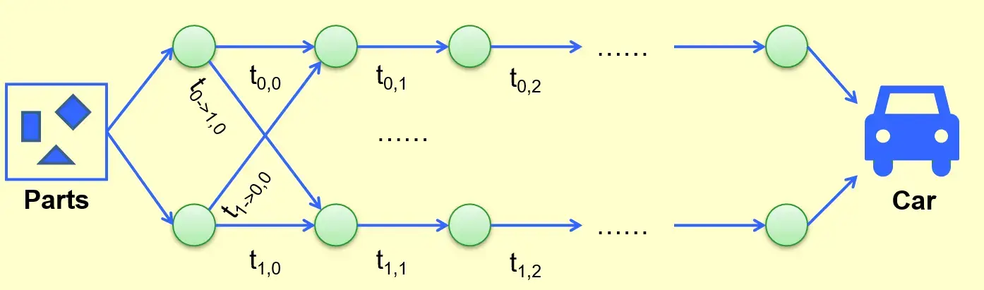 f[line][stage] = min(f[line][stage-1] + t_process[line][stage-1],f[1-line][stage-1] + t_transit[1-line][stage-1]);